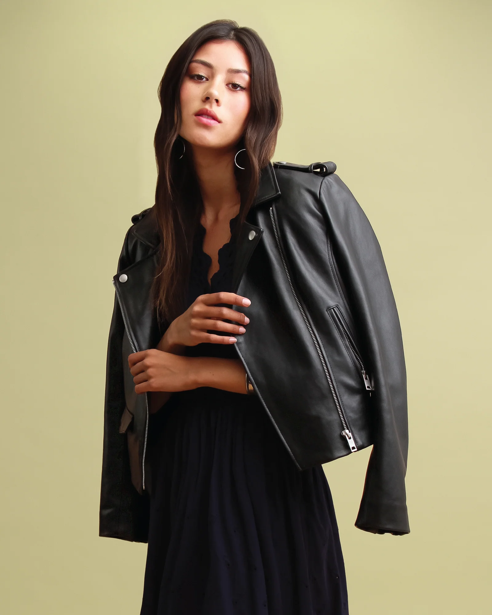 Bring an effortless luxe feel to any outfit with the Just Friends Leather Jacket by Belle & Bloom. A true wardrobe staple, this jacket is entirely crafted from genuine sheep leather and punctuated with silver-toned hardware. It features a zip-through front, notched lapels, zip-open cuffs and two zipped pockets.